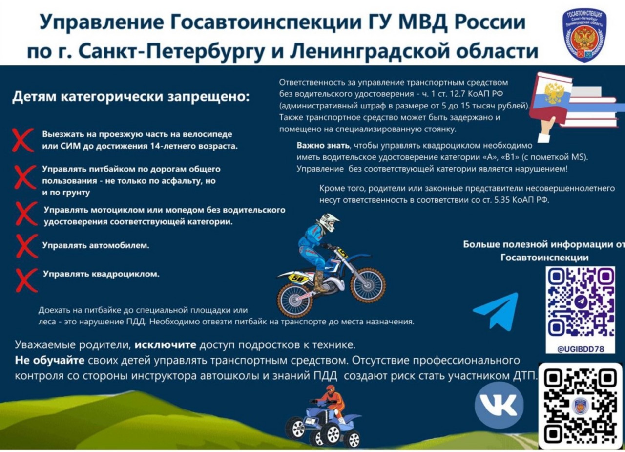 Обращаем внимание на важность соблюдения правил эксплуатации велосипедов, самокатов, средств индивидуальной мобильности и мототехники. Напомните детям как правильно и безопасно использовать средства индивидуальной мобильности, как велосипедист должен пересекать проезжую часть. Управление Госавтоинспекции по г. Санкт-Петербургу и Ленинградской области напоминает о необходимости неукоснительного соблюдения Правил дорожного движения.