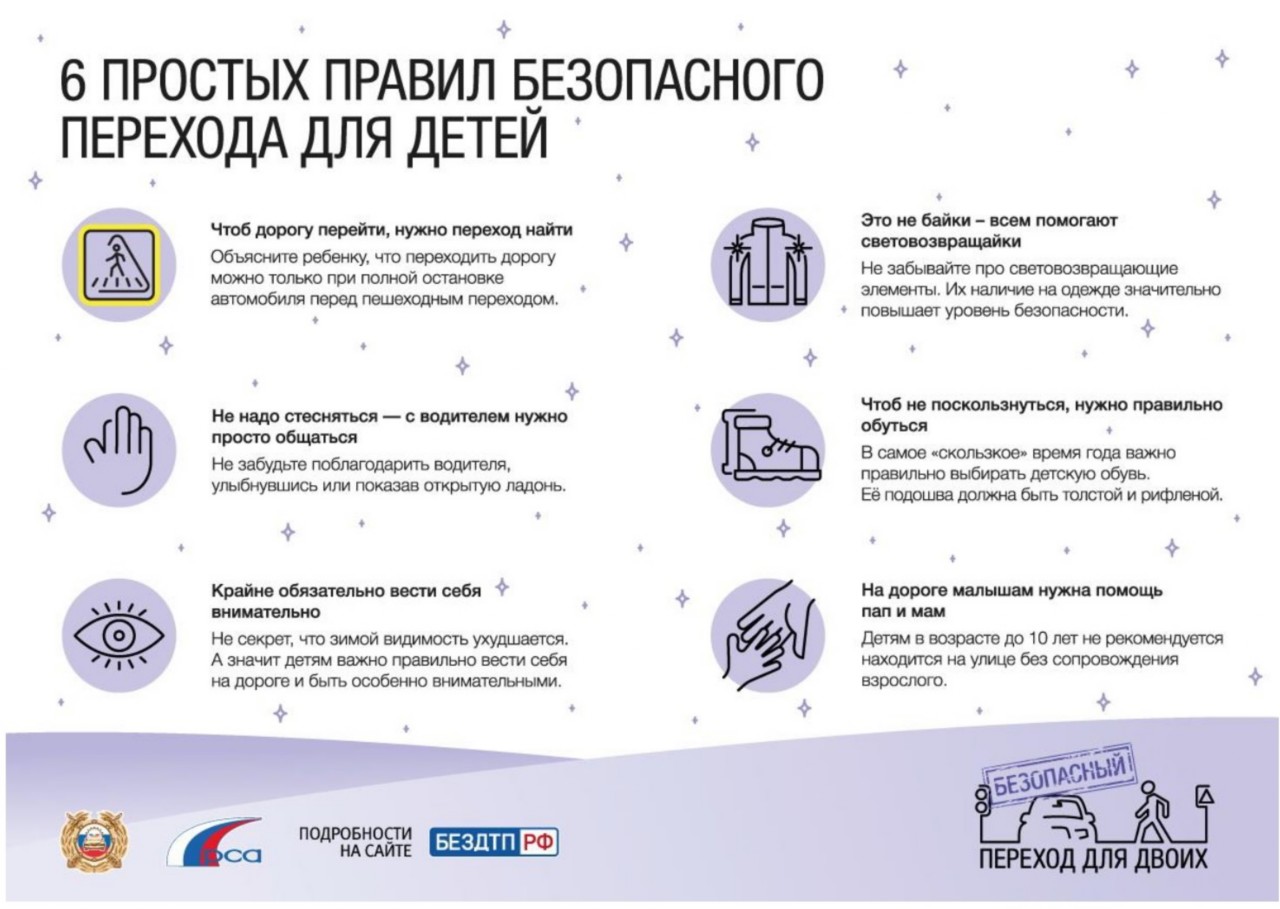 Напомните детям о том, что перед тем, как выйти на проезжую часть, нужно убедиться, что дорога просматривается на достаточном расстоянии, а водители увидели и пропускают пешеходов. Напомните детям, что автомашина моментально остановиться не может и во избежание ДТП необходимо усиливать бдительность, как при пересечении проезжей части, так и при нахождении вблизи неё. В соблюдении Правил дорожного движения будьте примером для своих детей! И помните, что безопасность детей во многом зависит о Вас!